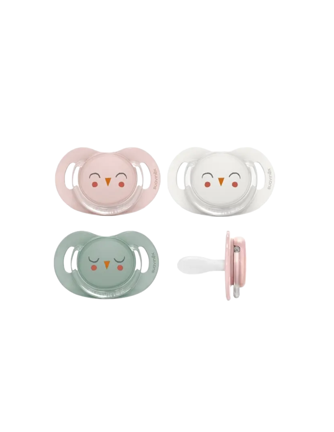 Su tetina está hecha con silicona médica, un material blandito que no se deforma. Se puede utilizar como un chupete normal. Se recomienda que durante los primeros meses se esterilicen los chupetes de Suavinex, al menos una vez al día, así como cuando se compra un chupete nuevo.