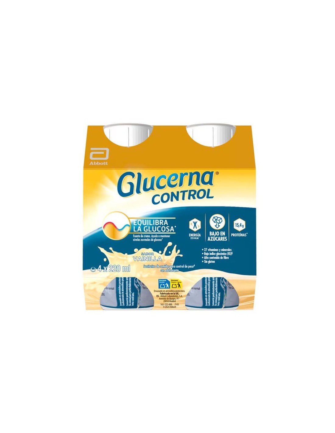 Pack compuesto por cuatro botellas de Glucerna Control sabor vainilla (220 ml cada una), un batido sustitutivo de comida científicamente formulado para ayudar al control del peso y mantener niveles normales de glucosa sanguínea. Es ideal como reemplazo de una o dos comidas en una dieta hipocalórica orientada al control o pérdida de peso.