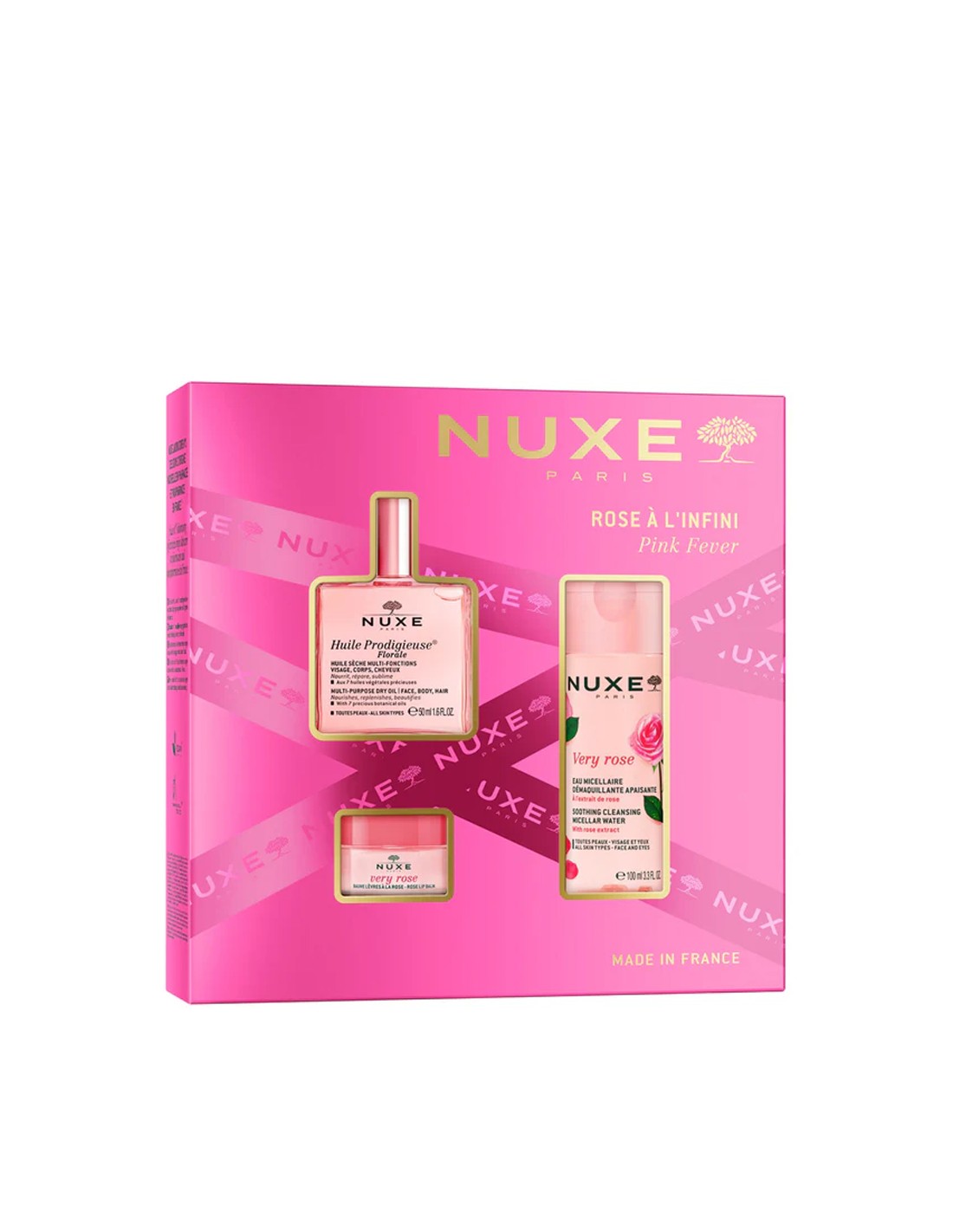 El Cofre Nuxe Rose à l’Infini reúne tres cuidados esenciales para una rutina completa de belleza con aroma floral. Incluye el icónico Huile Prodigieuse Florale de 50 ml, un aceite seco multifunción para rostro, cuerpo y cabello; el Agua Micelar Very Rose de 100 ml, que limpia y desmaquilla suavemente; y el Bálsamo de Labios Very Rose de 15 g, que nutre y protege los labios. Es un pack ideal para regalar o disfrutar de una experiencia sensorial completa con el delicado perfume de la rosa.