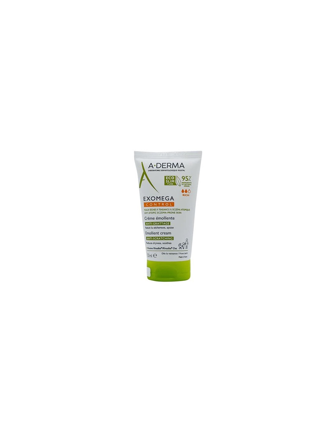 A‑Derma Exomega Control Crema Emoliente 50 ml es una crema calmante y nutritiva indicada para pieles secas con tendencia atópica. Ayuda a reducir el picor, la irritación y el enrojecimiento gracias a su fórmula rica en extracto de Avena Rhealba®, un activo vegetal con propiedades antiinflamatorias y suavizantes. Su textura emoliente aporta confort inmediato y contribuye a espaciar los brotes de irritación. Es apta para bebés, niños y adultos, incluso desde el nacimiento. Información basada en la web oficial de A‑Derma.