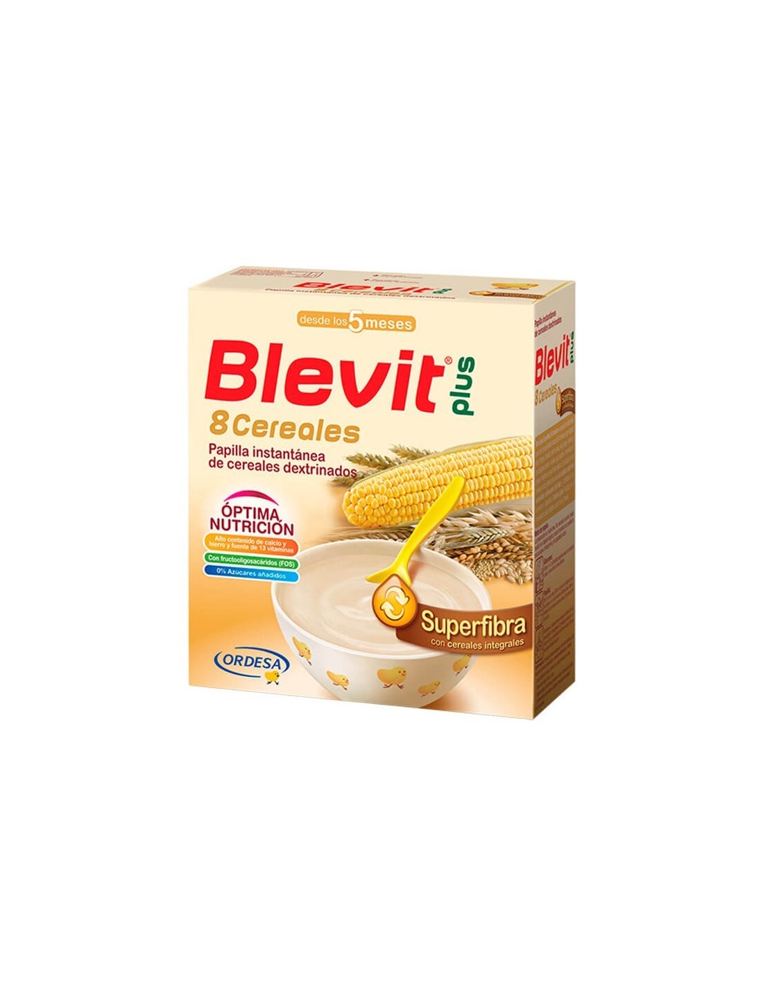 Blevit Plus Superfibra 8 Cereales está compuesto por una cuidada selección de cereales (trigo, arroz, avena, cebada, centeno, maíz, mijo y sorgo) que aportan una gran cantidad de nutrientes esenciales para el bebé. Además, contiene fructooligosacáridos (FOS) que favorecen el tránsito intestinal y ayudan a prevenir el estreñimiento. No contiene azúcares añadidos ni colorantes artificiales.