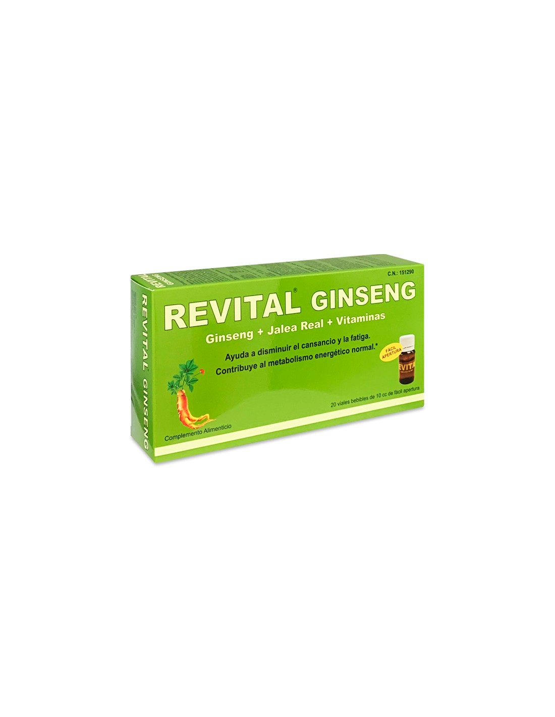 Revital Ginseng es un complemento alimenticio a base de Ginseng que contribuye al metabolismo energético normal, Jalea Real, Vitaminas C y B5 que ayudan a disminuir el cansancio y la fatiga.