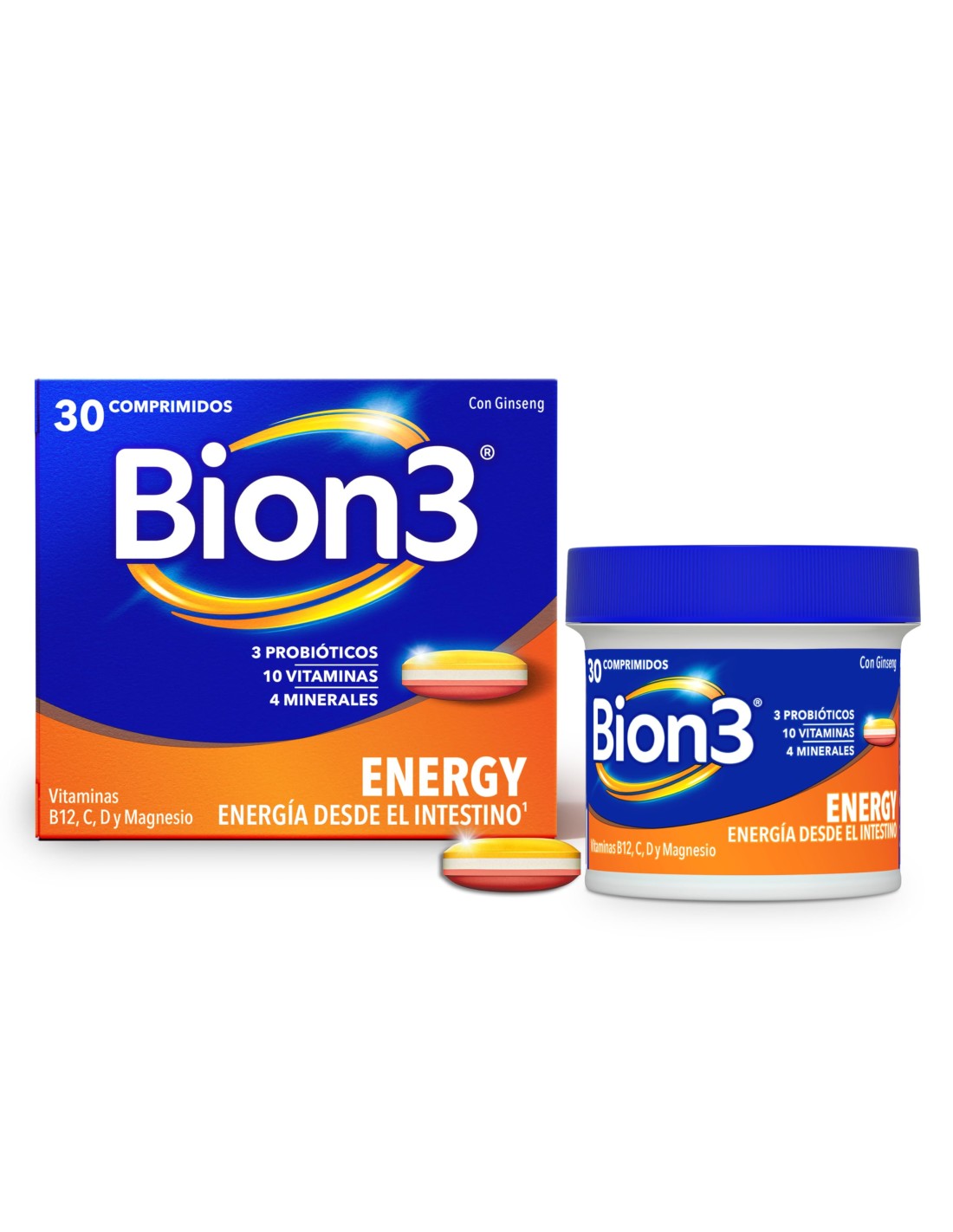La composición de Bion 3 Energy tiene minerales: yodo y hierro; también lleva vitaminas: B1, B2, B3, B5, B6, B8, B9, B12 y vitamina C; un estimulante como es el ginseng y, finalmente, la triple cepa patentada de Bion3: con una cantidad que asciende a 10^7 UFC de una mezcla triple que contiene Lactobacillus gasseri PA 16/8, Bifidobacterium bifidum MF 20/5 y Bifidobacterium longum SP 07/3.